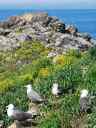 鮫駅から歩いて15分くらいです。島ではなく、陸伝いの小さな丘で、頂上に神社があります(階段で登り2分) 階段に向かって右下の磯場、神社のある頂上、の二箇所から撮影できます ウミネコは大体3月から8月までいるそうですが、写真は6月上旬の孵化期です。
