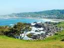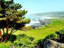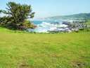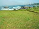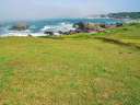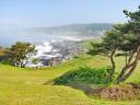 波打ち際まで芝生が広がる珍しい海岸です。駅から海辺まで徒歩5分程度です。海に向かって左奥の方がだんだん高く丘のようになっているので、そこから海を見下ろすように撮るとスケール感が出ます