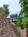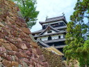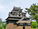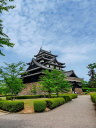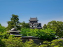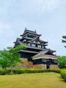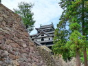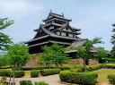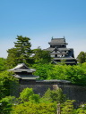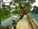 松江城: 天守閣前は広い公園です。遠望は南側の島根県庁二階のベランダ(入場可)から、更に東側の掘に架かる北惣門橋、宇賀橋辺りからの姿がいい構図です。